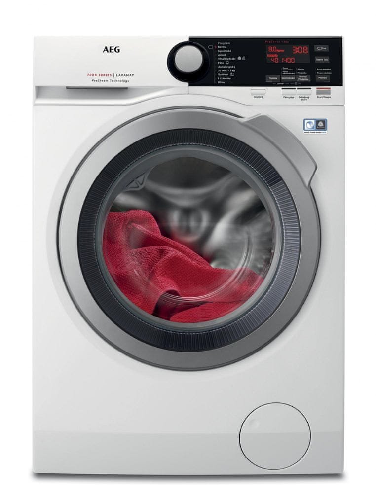 Předem plněná pračka AEG L7FBE68SC v energetické třídě A+++ pro 8 kg prádla. Pračka dosahuje 1600 ot./min., disponuje parním a antialergickým programem a funkcí pro úsporu času.